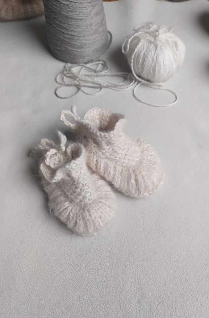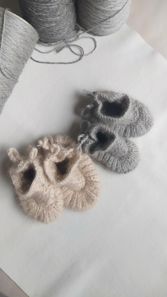 Zīdaiņu zābaciņi adīti no 100% Angoras vilnas, ļoti silti un mīksti.